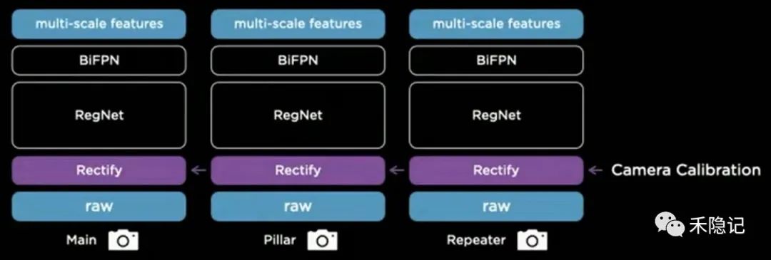 特斯拉通过不同的汽车采集到的数据共同构建一个通用的感知网络架构,然而不同汽车由于摄像头安装外参的差异,可能导致采集的数据存在微小偏差,为此特斯拉在感知框架中加入了一层“虚拟标准相机”,引入摄像头标定外参将每辆车采集到的图像数据通过去畸变、旋转等方式处理后,统一映射到同一套虚拟标准摄像头坐标中,从而实现各摄像头原始数据的“校准(Rectify)”,消除外参误差,确保数据一致性,将校准后的数据喂养给主干神经网络进行训练。