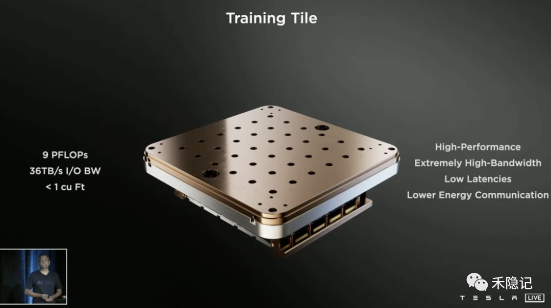 同时D1芯片之间可以实现无缝连接,特斯拉将25个D1芯片连接起来组成了独立的训练模块,模块算力高达9 PFLOPs(每秒处理9千万亿次),I/O带宽最大达每秒36TB。
