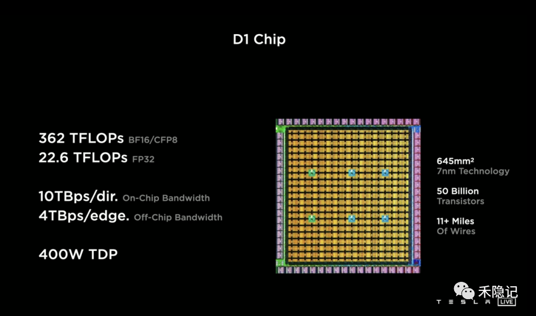 D1芯片采用分布式结构和7纳米制造工艺,单片面积仅645平方毫米,具有500亿个晶体管和354个训练节点,内部电路长达17.7公里,单片FP32算力可达22.6 TOPs,BF16 算力可达362 TOPs,1TOPS代表处理器每秒钟可进行一万亿次(10^12)操作,同时具有GPU级的计算能力和CPU的连接能力,I/O带宽是最先进的网络芯片的2倍。