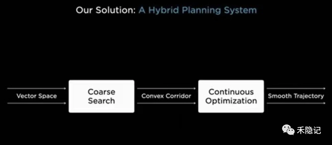 特斯拉采用的解决方案是将传统规划控制方法与神经网络算法相结合,构建一套混合规划系统,以任务分解的方式分别解决上述两大难题,其规划控制逻辑如下图所示。