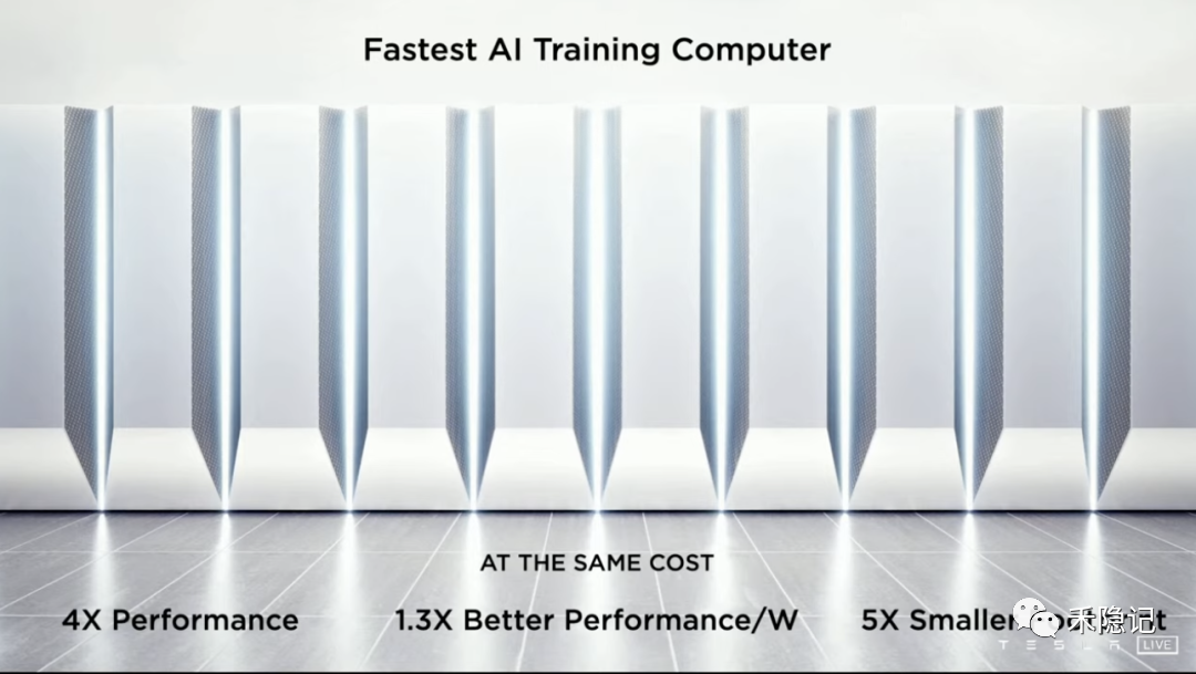 那么将120个训练模块(包含3000颗D1芯片)集成在一块,就组成了AI训练计算机柜——Dojo ExaPOD,其包含超过100万个训练节点,BF16/CFP8算力高达1.1 EFLOPs(每秒110京次的浮点运算,1京=10^18),超越了当时排名全球第一的日本富士通0.415 EFLOPs,且在相同成本下,ExaPOD具有4倍性能和1.3倍能耗节约,碳排放仅占1/5。