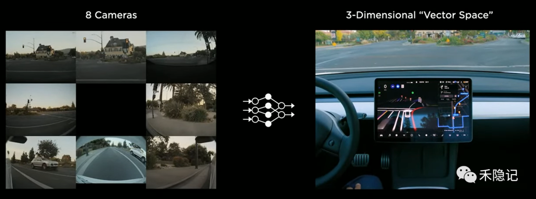 为了应对这一问题,使感知结果更准确,特斯拉采用“前融合”的思路,将车身四周的多个摄像头获得的不同视频数据直接进行融合,然后用同一套神经网络进行训练实现特征从二维图像空间到三维向量空间的变换。