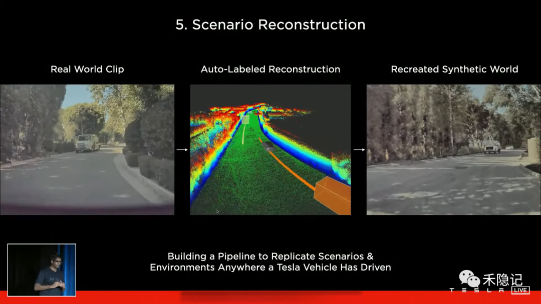 除了直接在虚拟场景中进行仿真训练,特斯拉还希望可以在仿真环境中重现真实世界场景,以便可以复现FSD失败的场景,实现在仿真环境下的优化迭代后再反哺汽车算法模型,实现“数据闭环”,因此在完成真实世界片段的自动标注重建后,再叠加视觉图像信息,生成与真实世界“孪生”的虚拟世界。