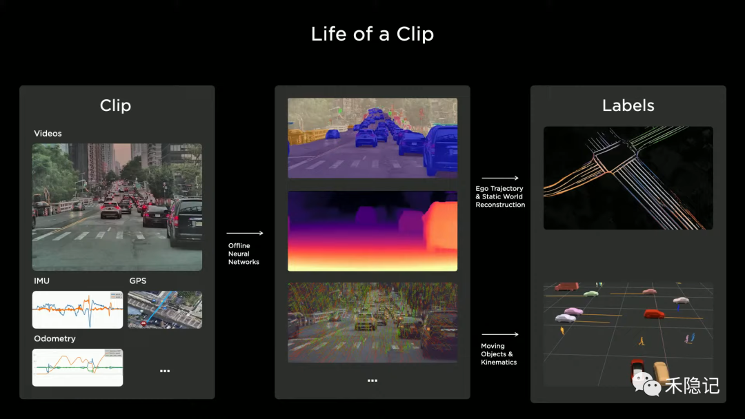 特斯拉实现自动标注的方案是通过汽车在一段时间内采集到的视频、IMU、GPS、里程表等数据构成最小标注单元(Clip),由离线神经网络系统训练得到中间层结果,如目标物、语义分割、深度、光流等,再通过大量机器算法生成最终用以训练的标签集,包括行车轨迹、静态环境重建、动态物、运动学参数等,人工可以对自动生成的标签集进行调整干预。