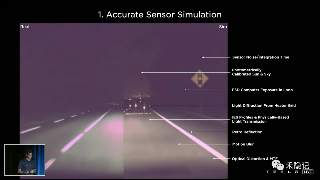 自动驾驶的实现首先是基于感知能力,因此对感知系统的准确仿真非常关键,特斯拉的感知系统是基于纯摄像头,因此对摄像头的各种属性进行软硬件建模,如传感器噪声、曝光时间、光圈大小、运动模糊、光学畸变等,甚至对于挡风玻璃上的衍射斑这种细节,特斯拉也考虑在内,这套准确的传感器仿真系统不仅可以用以FSD的训练和验证,还可以指导摄像头的硬件选型和设计。