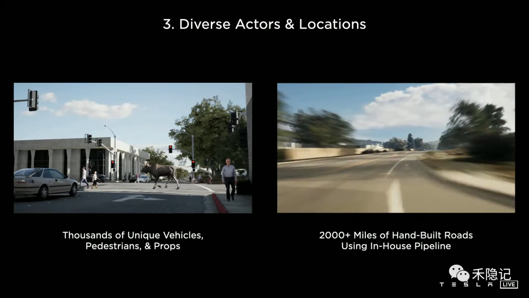 为了避免仿真环境过于单一,导致感知系统过拟合的问题,特斯拉对仿真环境参与物进行了充分的建模,包括多元交通参与者(例如车、行人等)和静态环境物(例如建筑、树、道路等)等,截至最新Tesla AI Day公开的信息,特斯拉总共已经绘制了2000+公里的道路环境。