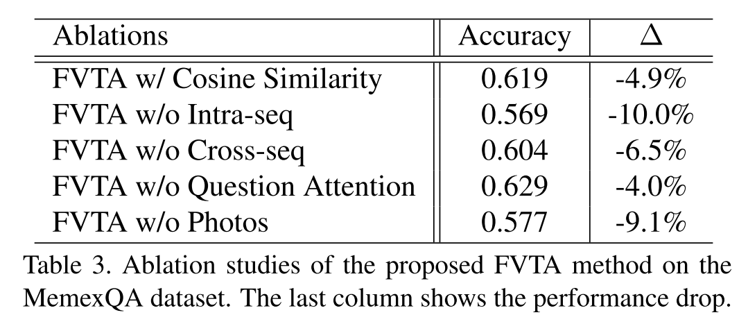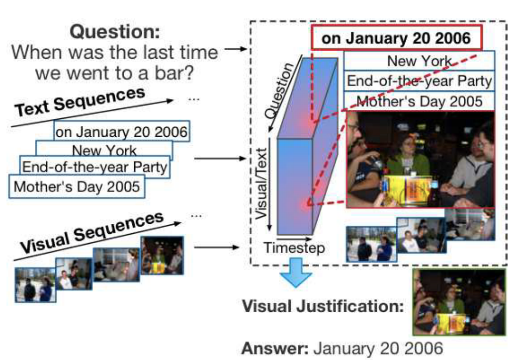 从VQA延伸到单个图像,本文考虑以下问题:假设一个用户的照片和视频按其创建时间的顺序组织。一些照片或视频可能与元标签或注释(如时间、GPS、标题、评论和有意义的标题)相关联。我们有兴趣训练一个模型来回答关于这些图像和文本的问题,例如,“我上次去酒吧是什么时候?”或者“我儿子在2017年万圣节晚宴后做了什么?”