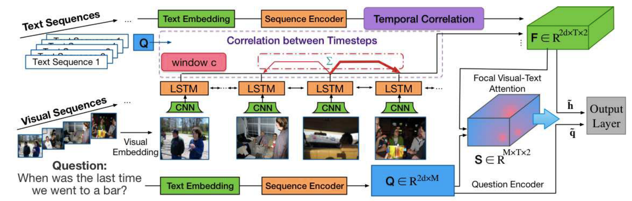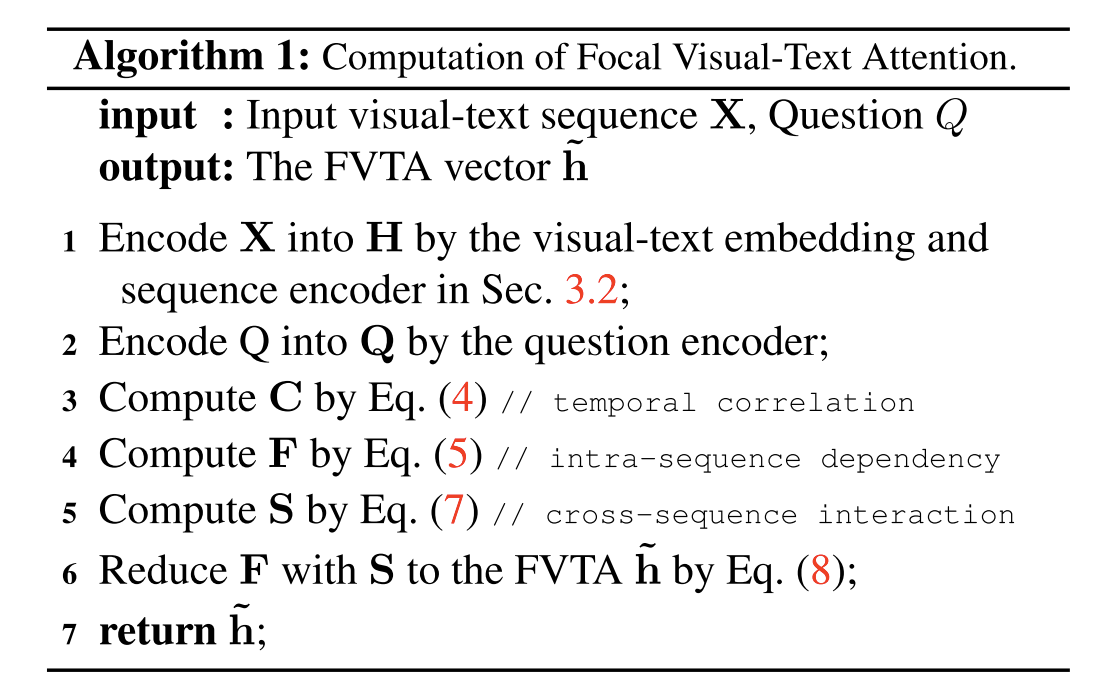 Focal Visual-Text Attention FVTA是实现所提出的注意机制的一个新层。它表示一个网络层,该层对问题和多维上下文之间的相关性进行建模,并将汇总后的输入输出到最终的输出层,和