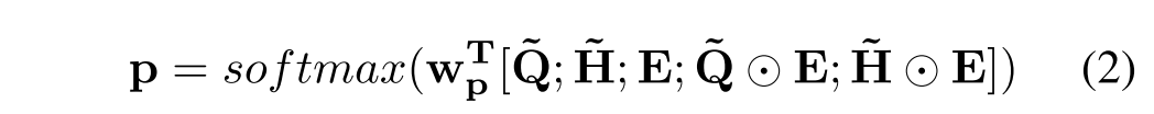 其中,符号[·;·]表示沿最后一个维度的两个矩阵的连接。⊙是元素级的乘法,是要学习的权重向量,p是分类概率的向量。在获得答案概率后,利用交叉熵损失函数对模型进行端到端的训练。