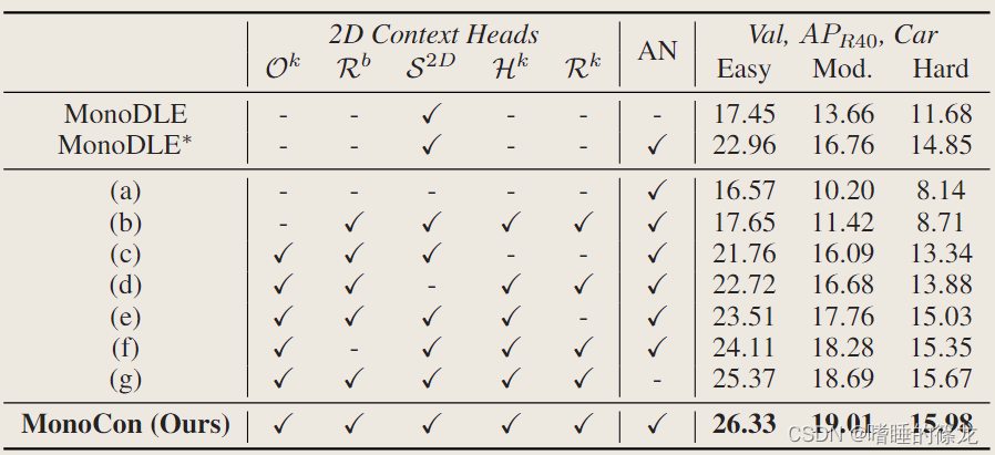 从整体上来看,MonoCon是在MonoDLE的基础上,加入了投影的2D辅助学习模块以及对所有的Head加入了AN(Attentive Normalization)模块,从实验结果来看,这些trick的效果是非常work的,如下图所示