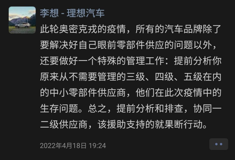 理想创始人李想4月发了一条朋友圈,呼吁汽车品牌深入供应链,关注、援助经常被忽视的低线供应商。它们最容易被外部侵扰影响,但也是不可或缺的一环。疫情让车企更加确定,需要与供应商加强沟通与合作,互相扶持、抵抗风险。