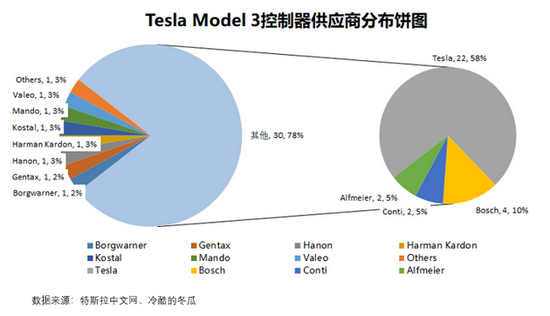 特斯拉电子电气架构设计达成的一个非常重要的目标就是功能的重新分配,不断把功能从供应商手中拿回来自行开发,根据特斯拉中文网“冷酷的冬瓜”的统计,最新的Model3,特斯拉控制器自研的比例已经超过一半。