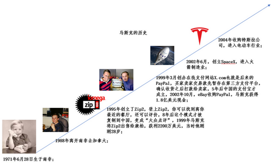 1971年,马斯克出生于南非,1988年离开南非去了加拿大,随后又辗转到了美国,是地地道道的“美漂”。1995年,首次创业的马斯克成立了Zip2,这比中国的“大众点评”早了8年。