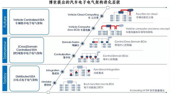 按照博世提出的汽车电子电气架构进化层级,特斯拉目前至少已经处于车载电脑阶段,而绝大部分新能源汽车厂商,现在还处于基础的从模块化到集成化阶段。