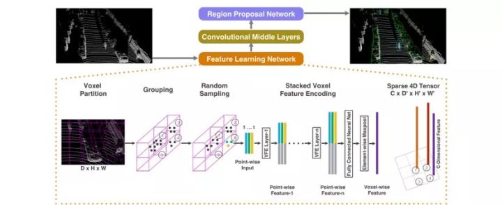 Voxelnet,Voxelnet把激光点云在空间中均匀划分为不同的voxel,再把不同voxel中的点云通过提出的VFE(Voxel Feature Encoding)层转换为一个统一的特征表达,最后使用RPN(Region Proposal Network)对物体进行分类和位置回归,整体流程如图Fig.2所示。