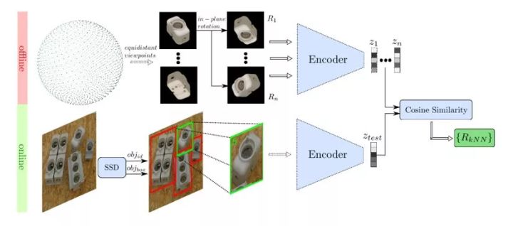 作者主要是提出了一种新型的基于去噪自编码器DA(Denoising Autoencoder)的3D目标朝向估计方法,使用了域随机化(Domain Randomization)在3D模型的模拟视图上进行训练。在进行检测时,首先使用SSD(Single Shot Multibox Detector)来进行2D物体边界框的回归和分类,然后使用预先训练的深度网络3D目标朝向估计算法对物体的朝向进行估计。在模型的训练期间,没有显示地从3D姿态标注数据中学习物体的6D pose,而是通过使用域随机化训练一个AAE(Augmented Autoencoder)从生成的3D模型视图中学习物体6D pose的特征表示。