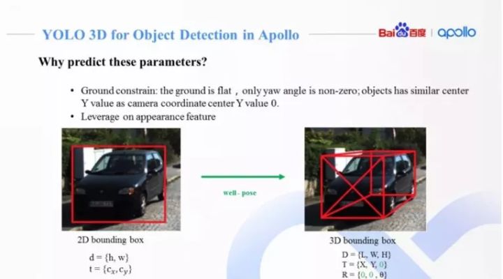 通过神经网络预测3D障碍物的9维参数难度较大,利用地面平行假设,来降低所需要预测的3D参数。1)假设3D障碍物只沿着垂直地面的坐标轴有旋转,而另外两个方向并未出现旋转,也就是只有yaw偏移角,剩下的Pitch和Roll均为0。障碍物中心高度和相机高度相当,所以可以简化认为障碍物的Z=0;2)可以利用成熟的2D障碍物检测算法,准确预测出图像上2D障碍物框(以像素为单位);3)对3D障碍物里的6维描述,可以选择训练神经网络来预测方差较小的参数。