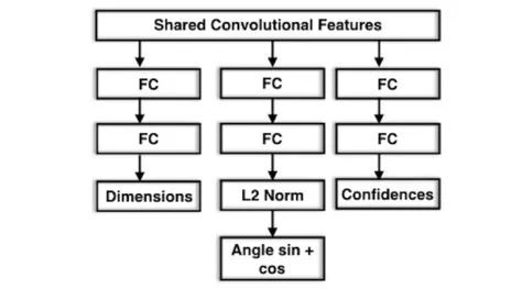 同时,作者还提出了MultiBin的结构来进行姿态的估计,首先离散化旋转角到N个重叠的Bin,对个每一个Bin,CNN网络估计出姿态角度在当前Bin的概率,同时估计出角度值的Cos和Sin值。网络整体结构如下图Fig.12所示,在公共的特征图后网络有三个分支,分别估计3D物体的长宽高、每个Bin的置信度和每个Bin的角度估计。