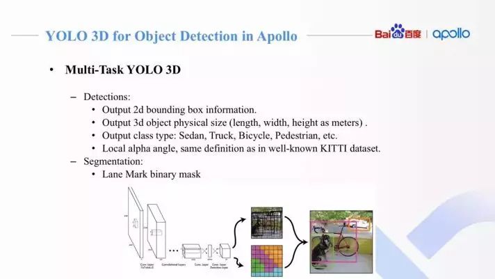 以开源的Apollo为例,Apollo中使用的YOLO 3D,在Apollo中通过一个多任务网络来进行车道线和场景中目标物体检测。其中的Encoder模块是Yolo的Darknet,在原始Darknet基础上加入了更深的卷积层同时添加反卷积层,捕捉更丰富的图像上下文信息。高分辨多通道特征图,捕捉图像细节,深层低分辨率多通道特征图,编码更多图像上下文信息。和FPN(Feature Paramid Network)类似的飞线连接,更好的融合了图像的细节和整体信息。Decoder分为两个部分,一部分是语义分割,用于车道线检测,另一部分为物体检测,物体检测部分基于YOLO,同时还会输出物体的方向等3D信息。