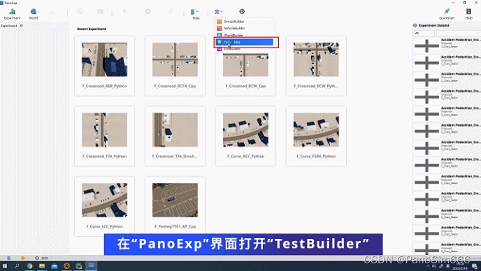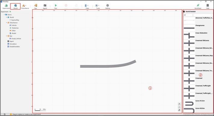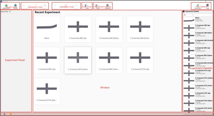 ⚫ PanoExp:实验主界面,用于创建和定义实验。一个实验包括:测试场景、一辆至多辆实验车(加装传感器)、驾驶任务、控制模型和仿真设置参数。