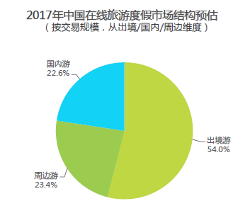 行业新增长点:在线旅游行业市场交易规模的增速持续放缓,预计到2020年增速将降低到12.2%。在线旅游大行业增速放缓的同时,在线度假业务却能保持高速增长。2017年中国在线度假市场自营类交易规模为979.9亿元,较2016年增长31.8%。在线度假市场规模高速增长,主要贡献是出境游业务,2017年出境游占比为54.0%,超过一半交易额,较去年上升0.7个百分点,表明出境游是在线度假中最重要的业务,是行业的新增长点。