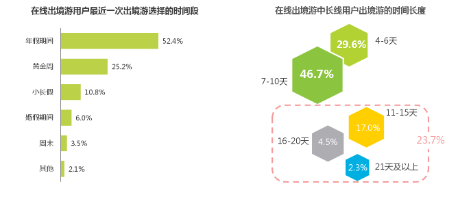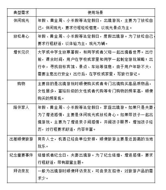 在线出境游用户选择的时间段主要有:年假(52.4%)、黄金周(25.2%)、小长假(10.8%)、婚假(6.0%)、周末(3.5%)、其他(2.1%)等。根据用户的典型需求和出游时间选择,推测这些典型需求的使用场景如下: