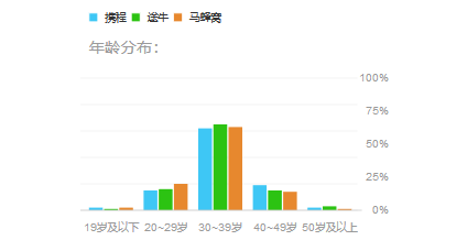 三款产品的用户年龄分布相似,绝大部分用户在40岁以下,其中30~39岁年龄段的占比最高,其次是20~29岁和40~49岁这两个年龄段占比较高。这三个年龄段的用户有经济基础并且有精力出去旅游,是在线旅游的主力用户。