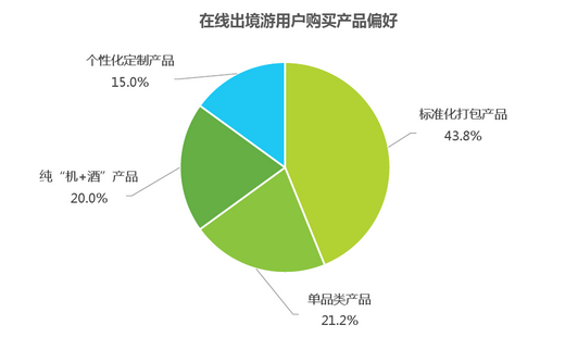 用户购买出境游产品的偏好:标准化打包产品(43.8%)、单品类产品(21.2%)、纯“机+酒”产品(20.0%)、个性化定制产品(15.0%)。