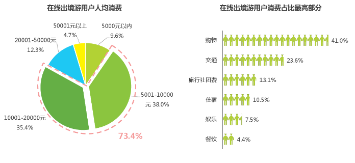 在线出境游用户人均消费最多的区间是5001~20000元(73.4%),同时用户最愿意把钱花在购物(41%)、交通(23.6%)、团费(13.1%)等项目上,因此这些项目是APP需要重点关注的对象。