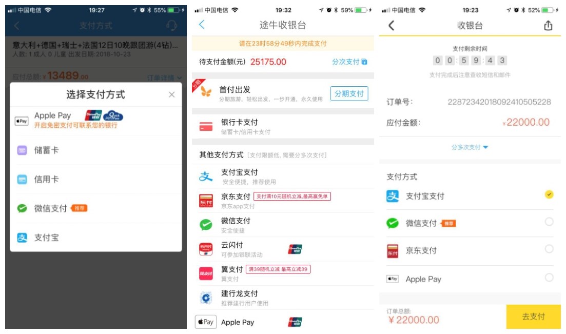 三款APP的支付过程都比较简单,携程和途牛的过程是首先选择产品,然后选择资源,再选择出行人,最后付款,一共四步。马蜂窝则没有选择资源这个步骤,一共三步。三者的支付步骤都很简单直接,没有增加用户的操作难度。途牛的支付方式最多,其次是携程,马蜂窝的支付方式最少,不过三者都含有支付宝支付和微信支付,都能够保障用户顺利、方便地支付。