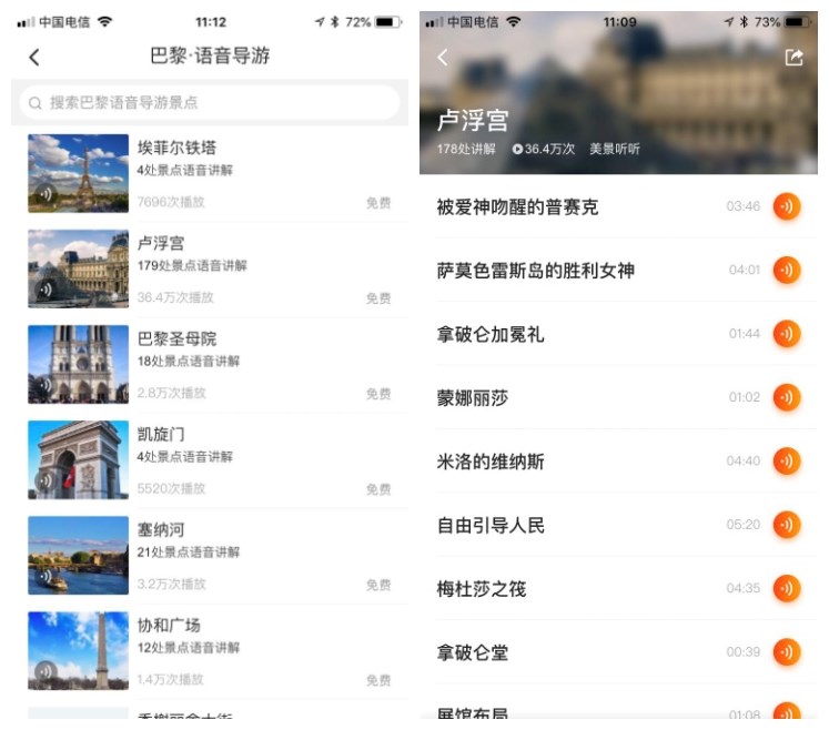 三款APP中只有携程有“语音导游”这个景区游览中可以使用的功能。语音导游也只是简单的罗列各个景区和景点的语音介绍,完全不能覆盖景点的细节,比如:景区大位置,景区入口位置,景区游览路线,景区各个景点的图文音介绍,景区的常用外文标志,景点的外文标志等等,可见各个APP对于游览中这个场景重视不足。