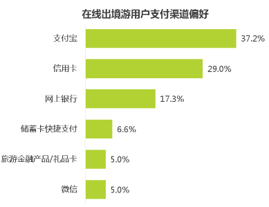 随着移动支付的飞速发展,越来越多的用户偏向于使用移动端支付,在线购买出境游产品的用户中有37.2%的用户偏好使用支付宝结算,29%的用户偏好使用信用卡结算,这两种方式都可以在支付宝内完成。用户使用手机APP选择产品,然后在手机端下单支付,简单的支付方式将更容易得到用户的青睐,APP应该简化支付流程,给用户更好的体验。