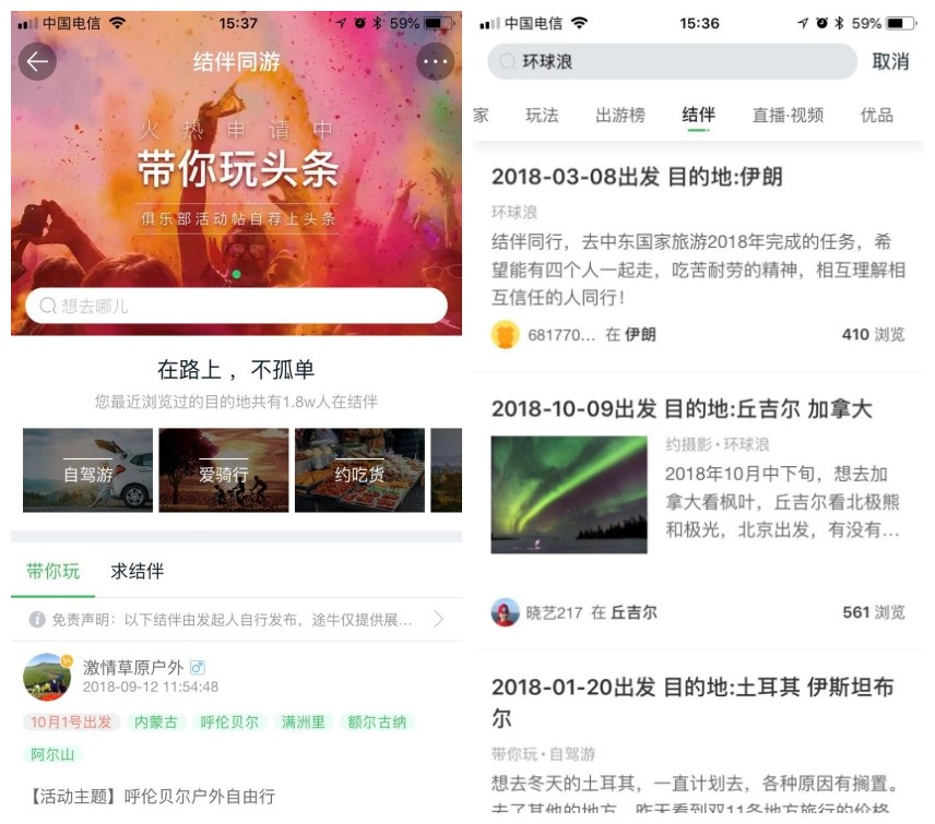 途牛的发现模块中求结伴功能做得最好。Banner颜色火热,让人一看就有社交的冲动。对结伴同游分类为:自驾游、爱骑行、约吃货、环球浪、约摄影,并根据结伴的主客体不同,分为:带你玩和求结伴。用户可以准确地找到有意向结伴同行的旅友,然后直接对话沟通,效率高。而对于游记展示则显得不足,入口隐蔽,用户只能在自己的主页看到动态的展示,在动态展示列表的页面中只有一张图显示,没有评论、点赞、收藏等功能,只能在动态内容页进行操作,用户在看到这个页面的时候,没有任何交互信息,感觉和动态之间是隔离的。