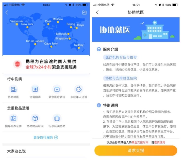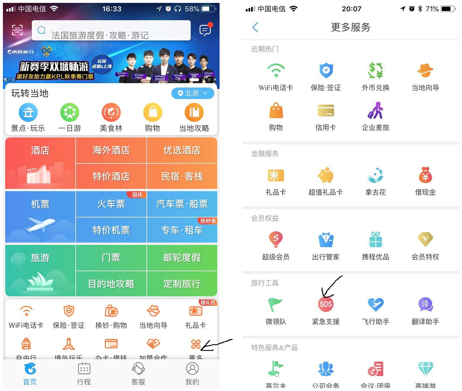 三款APP中只有携程有紧急支援模块。但是该模块入口隐秘,需要点击首页的“更多”,再在旅行工具中找“紧急支援”。建议将“紧急支援”放在首页的下面小图标中或者用户常用的模块中,比如“旅游”、“当地玩乐”等。