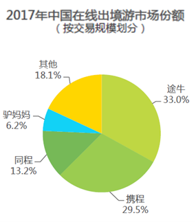 在2017年中国在线出境游市场中,途牛为市场第一,份额为33.0%,第二和第三是携程和同程,分别占比为29.5%及13.2%。有趣的是途牛处于第二梯队,但在出境游模块成功挑战了行业老大携程,占据第一位置。其原因是途牛的核心业务为在线跟团游,通过整合供应链,提升丰富和高品质的旅游产品,获取不少忠实的用户。