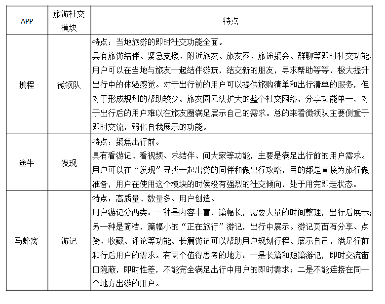 用户对旅游社交的需求分别是:出行前从有经验的人哪里获取信息,规划行程,空闲时翻阅;出行中发现有趣的活动,寻找同伴,寻求帮助等;出行后展示自己,结交朋友,为其他人传授经验。