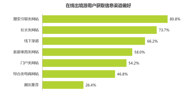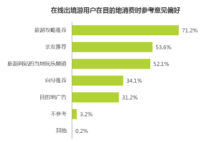 在线旅游用户在目的地消费时主要参考:旅游攻略推荐(71.2%)、亲友推荐(53.6%)、旅游网站的当地玩乐频道(52.1%)这三种方式。亲友的口碑传播是最让人信任的渠道,但是亲友的传播存在细节不清楚、实时性差、主观性的缺点。旅游攻略和当地玩乐频道最方便,实时性好,如果提升内容的可靠性,是最有希望成为用户最信任、最常用的渠道。