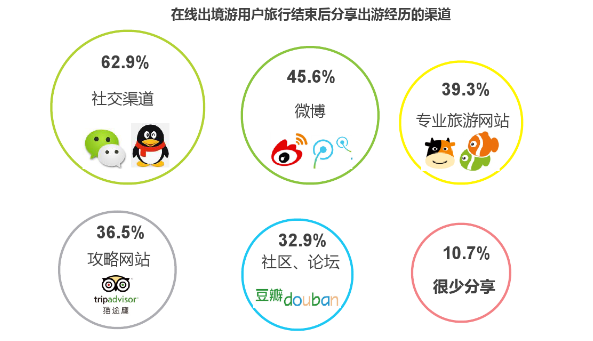 在线出境游用户出行后最重要的是分享出行经历,分享的主要渠道有社交渠道(62.9%)、微博(45.6%)、专业旅游网站(39.3%)、攻略网站(36.5%),这与用户出行前获取信息的渠道相呼应。社交网站是最主要的分享渠道,属于熟人传播,但难以转化为旅游网站的流量,因此构建旅游社区,同时具备社交网站和旅游网站的属性,是一种有效转化流量的方式,也是各旅游网站正在探索的模式。