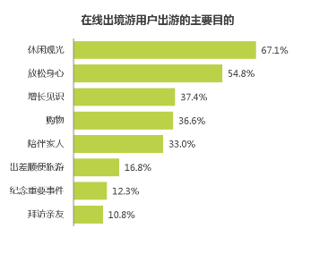 在线出境游用户出游的主要目的有:休闲观光(67.1%)、放松身心(54.8%)、增长见识(37.4%)、购物(36.6%)、陪伴家人(33%)、出差顺便旅游(16.8%)、纪念重要事件(12.3%)、拜访亲友(10.8%)等。