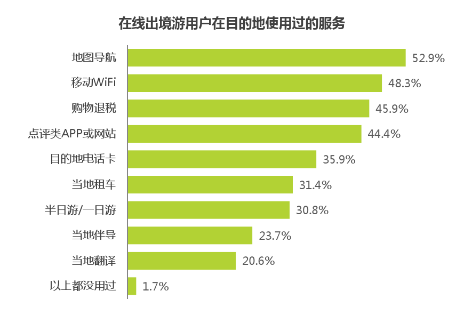 在线出境游用户在目的地使用最多的服务是地图导航(52.9%)、移动WiFi(48.3%)、购物退税(45.9%)、点评类APP或网站(44.4%)等。