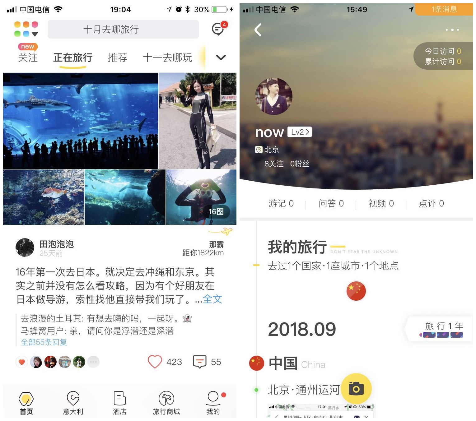 马蜂窝的游记展示有多图,且图片质量高,给人看了就有一种点开冲动。同时图下面有作者、地点、距离、点赞、阅读、评论等信息,给人很多交互信息,但又不杂乱。可以点开作者的主页,找到跟作者交流的入口,也是很方便。作者主页分为游记、问答、视频、点评四个模块,其他用户可以访问某个旅友在这几个模块的互动。同时以时间为主轴将图片和游记先后排列,展示了这个旅友的分享。