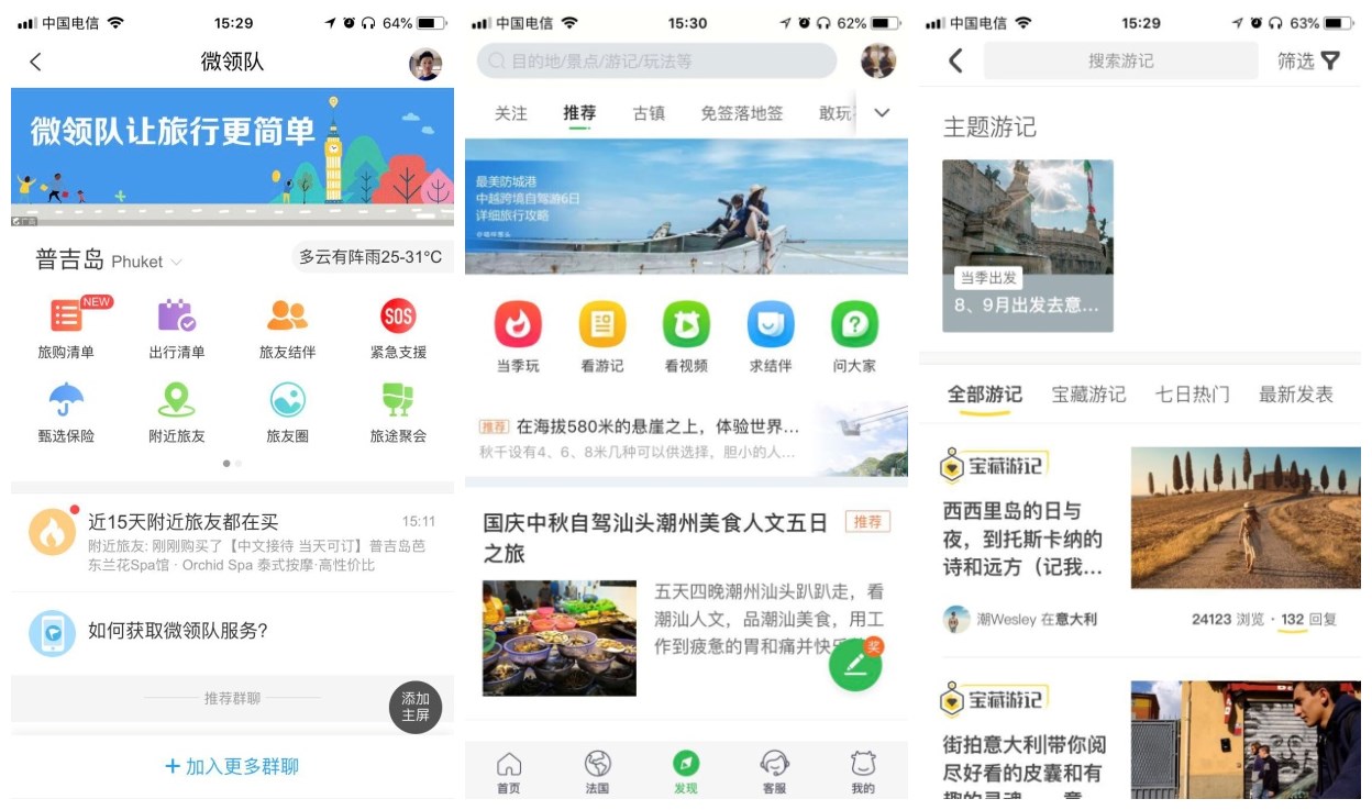 三款APP都有自己的旅游社交模块:携程的微领队、途牛的发现、马蜂窝的游记。