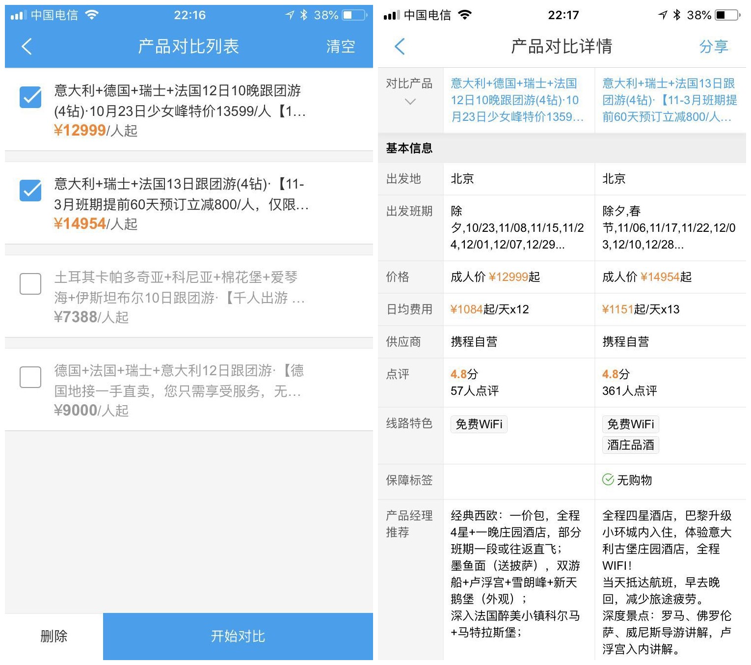 第二,APP提供比对功能,用户自己比对感兴趣的产品。比对功能可以比对两个或多个产品的细节,比如酒店、机票、汽车、景点、餐食等等因素,给出一个比对结果,结果表明各个产品的优缺点,用户再根据自己的偏好进行选择。这样也简化了用户筛选产品的难度。