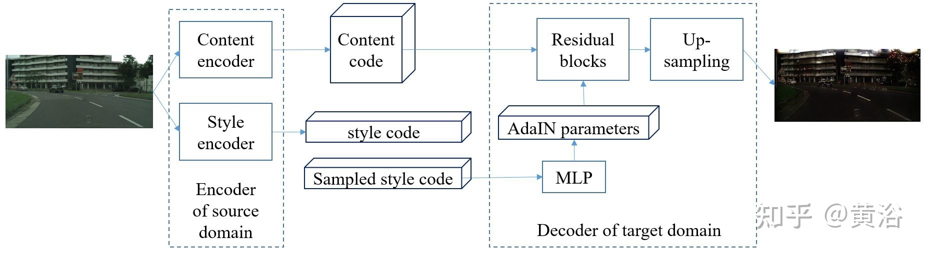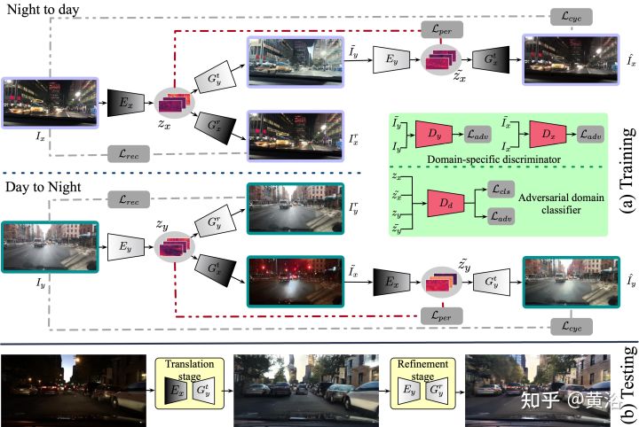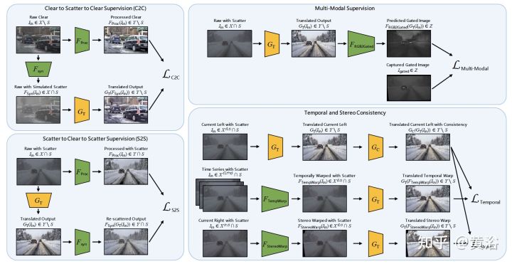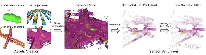 - 7)模拟仿真:模拟仿真需要对车辆/行人、传感器、交通环境和道路环境建模,有时候无法直接获得逼真的合成模型,特别是实际发生的交通事件,有时候不得不采用真实传感器数据来建模合成。下图是GAN-based的雨夜图像合成方法。