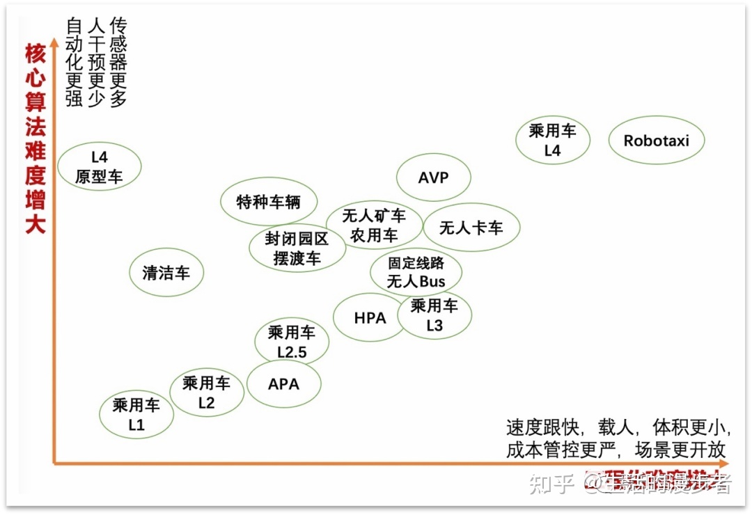 核心算法的难度和工程化难度是实现自动驾驶的关键难点。图23将常见的自动驾驶产品(或应用场景)在这两个纬度上进行了一个分布,便于比较。这只是一个粗略的示意图,两个轴也没有精确到比例尺含义,仅仅是相对位置提供一点参考意义。