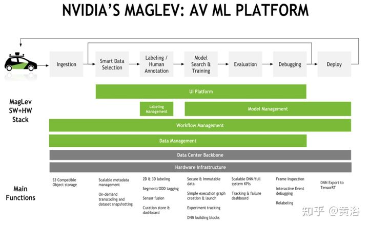 如图是英伟达公司在自动驾驶开发建立的机器学习平台MAGLEV,也是基于闭环的模型迭代:其中有smart的数据选择、数据标注、模型搜索、训练、评估、调试和部署。