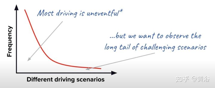 最近自动驾驶和数据闭环结合在一起,原因是自动驾驶工程已经被认可是一个解决数据分布“长尾问题”的任务,时而出现的corner case(极端情况)是是对数据驱动的算法模型进行升级的来源之一,如图所示。