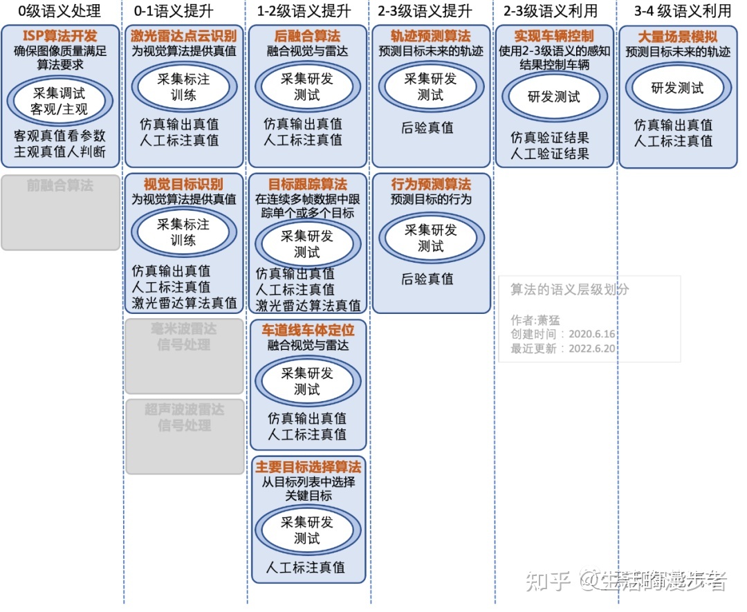 首先我们要分析出来涉及的各种算法,按照语义层级进行分割。按语义层级分割我们可以很方便的分析出哪些算法可以同时一起开发,高层级的算法可以使用仿真软件输出的低级语义。可以分析出算法需要的数据和真值,可以先通过仿真软件获取某些算法的数据集和真值。