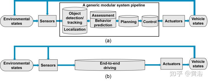 以下图(综述论文 “A Survey of Autonomous Driving: Common Practices and Emerging Technologies”)为例,现在自动驾驶的开发基本是模块化的(a),只有个别是采用端到端模式(b)。