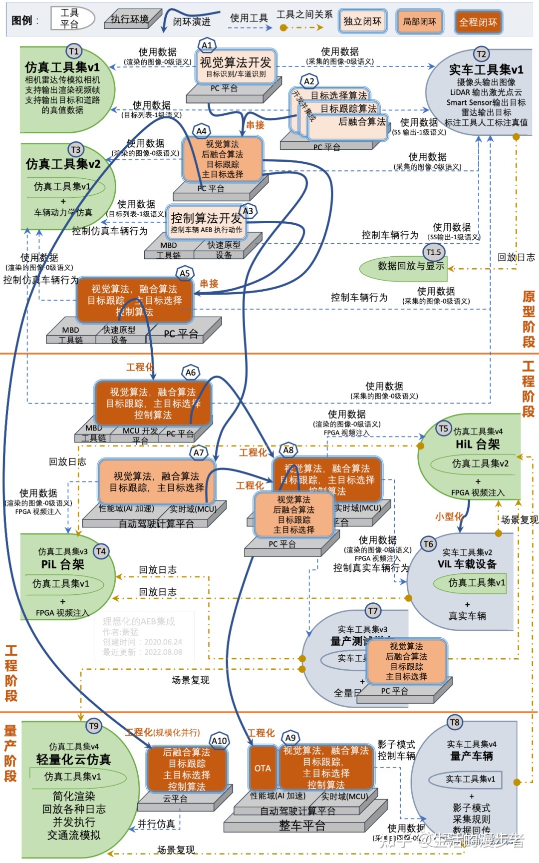 A5是原型阶段的最终形态,经过前面的逐级开发和串联,到这一步从感知到控制执行全部闭环(运行时闭环)连接在一起。AEB 案例和完全自动变道案例只是功能复杂度不同,在开发过程中所属阶段和测试环境也是一致的。